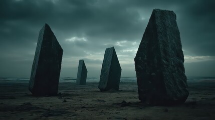 Abstract Monumental Stone Structures Standing on Barren Terrain Under Overcast Sky