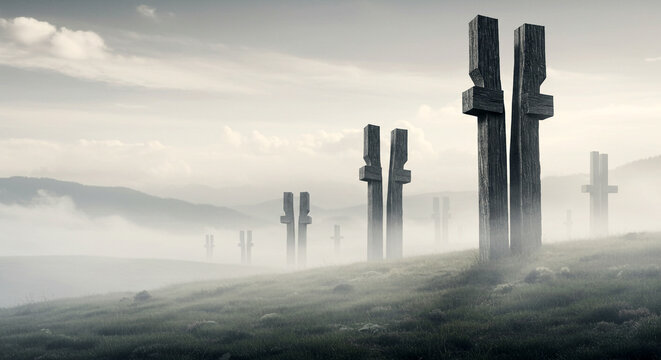 Mysterious ancient monolithic stone structures standing tall in a misty ethereal landscape under a cloudy sky