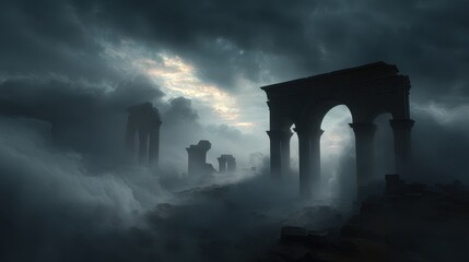 Dramatic ancient stone structure resembling an archway stands in a desolate field under a stormy cloudy sky