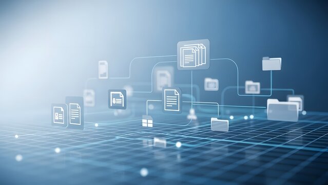 Digital network of document and folder icons connected by lines on a blue grid background. Concept of data transfer, cloud storage, file management, and database.