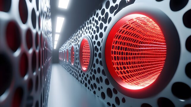 Futuristic, glowing, cylindrical data storage system in a dark, modern server room.