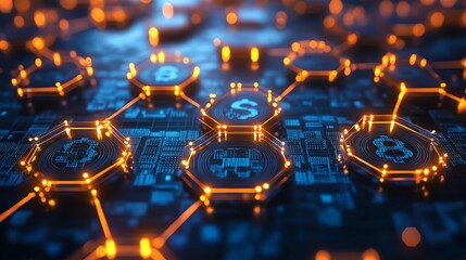Abstract glowing hexagons with dollar signs and bitcoin symbol on a futuristic digital circuit board background.