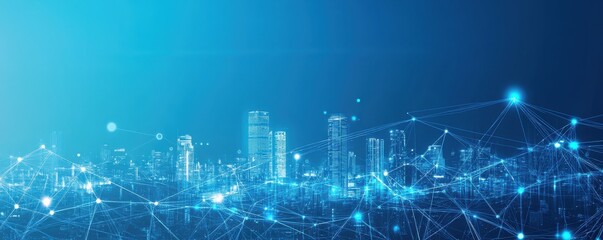 Futuristic city skyline with blue digital network lines and glowing dots against a dynamic blue background