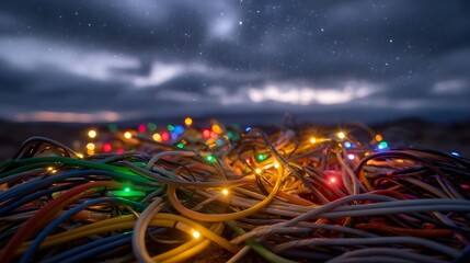 Pile of colorful tangled wires with lights under a starry night sky