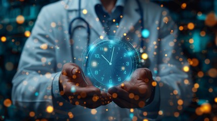 Doctor holding luminous abstract clock in hands in hospital, time concept, medical and healthcare