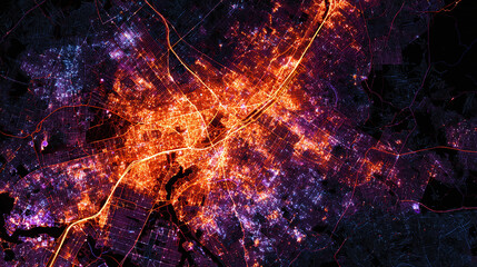 An aerial view captures the city lights at night, creating an impressive and abstract glow