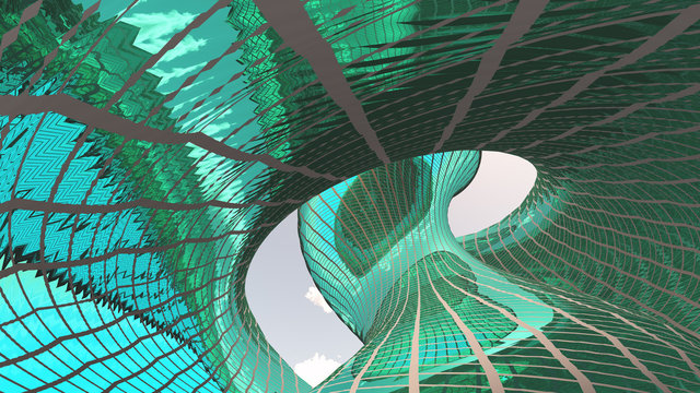 Peeling curved metal sheet unveiling glowing concentric tunnel with pastel holography