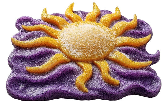 Glittering Golden Sun with Purple Clouds on Black Background, Shimmering Light