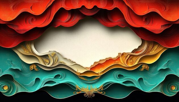 ornate layered paper-cut waves and swirling ribbons in red, teal and gold framing a blank cream center, dramatic elegant and luxurious composition