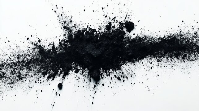 Black powder explosion on white background, creating a dynamic and abstract pattern with splatters and texture