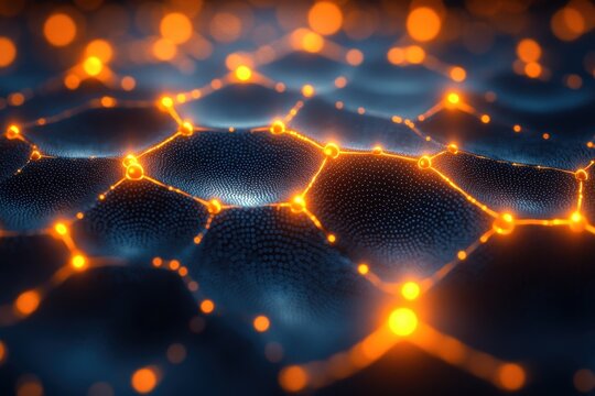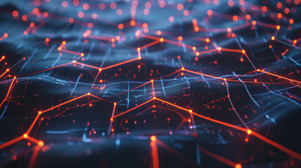 digital network visualization featuring interconnected nodes and lines, representing blockchain technology and data flow. glowing hexagonal shapes create futuristic and dynamic atmosphere