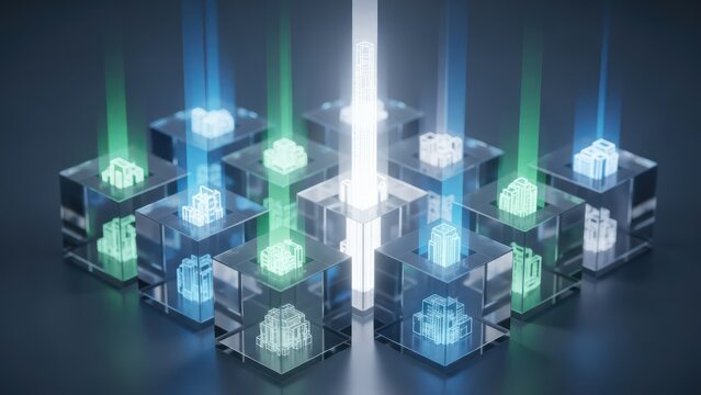 Futuristic digital cubes with glowing edges on a sleek dark background representing advanced technology and data processing in a stylized setting