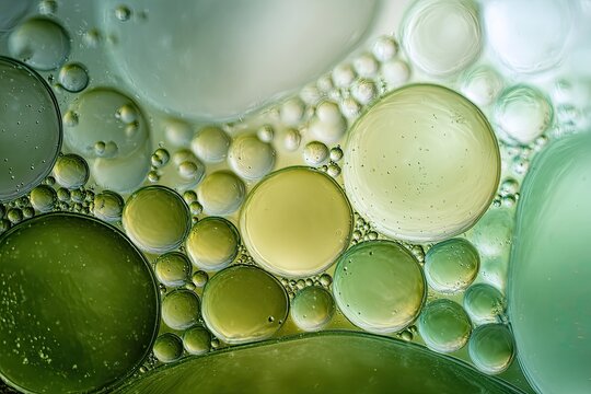 Close-up of light-colored oil droplets floating in water, various sizes and shades