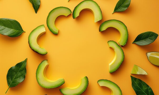 Avocado slices arranged in a circle with leaves on a pastel orange background