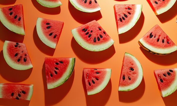 Sliced watermelon on a vibrant orange background, arranged in a flat lay pattern, offering fresh, natural summer vibes.