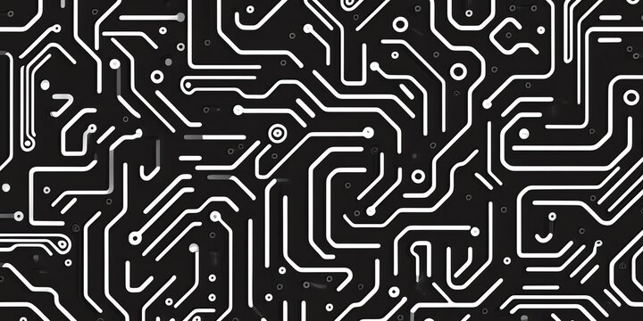 Abstract black and white circuit board background with white lines and small circles on a black background.