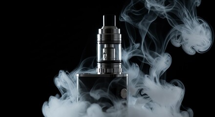 A close-up image of an electronic smoking device enveloped in wisps of vapor, black background