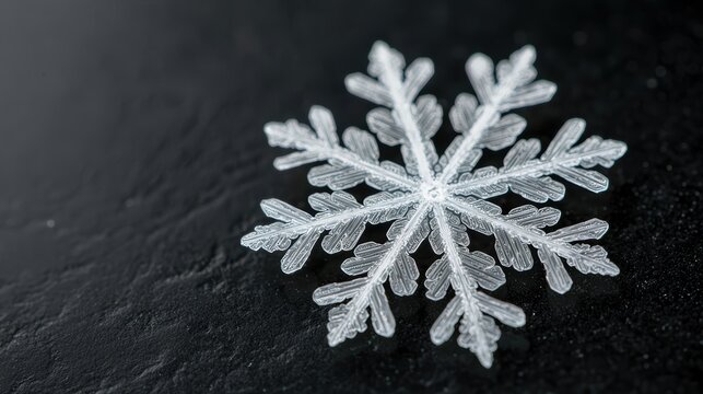 Intricate snowflake crystal on dark surface