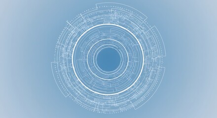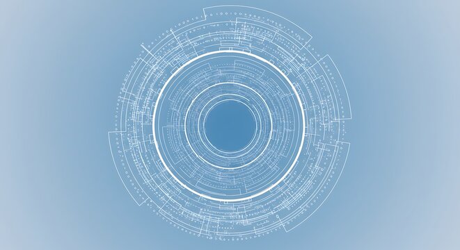 Futuristic circular interface with intricate white wireframe lines on a soft gradient background representing advanced technology