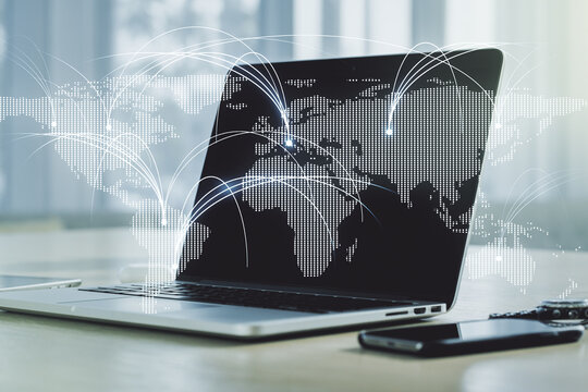 Double exposure of abstract digital world map with connections on laptop background, research and strategy concept