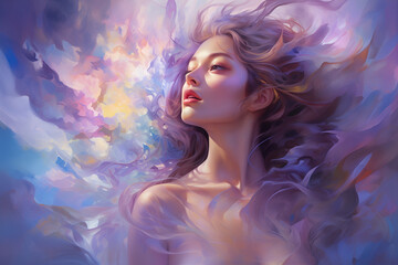 Explore an enchanting realm as a surreal female avatar surround by vibrant abstraction mist, Lose yourself in a dreamlike fusion of fantasy and reality, Ethereal female Art, Girls boundless wonders
