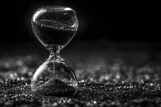 Hourglass on the sand. Black and white picture. The importance of time. Picture for background. Generated AI