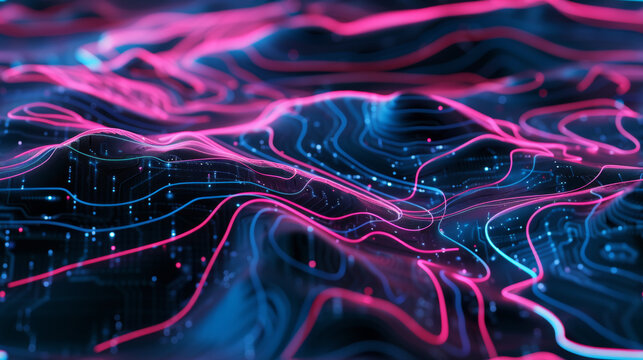 courbe de niveau d'un décor abstrait en relief avec des lignes lumineuses néon bleu et violet. Arrière plan motif futuriste