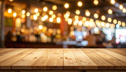 Wooden table in a blurred restaurant background with hanging lights