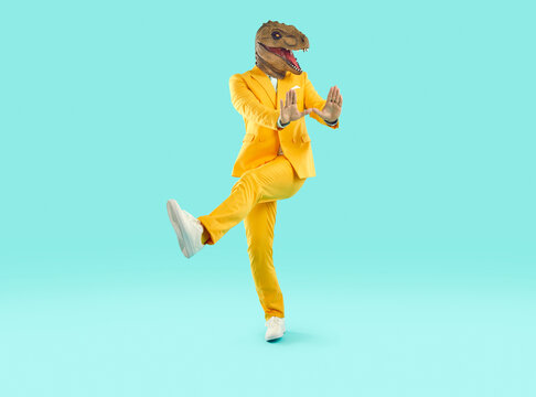 Funny man in a dinosaur costume dancing in the studio. Happy guy in a bright yellow suit and funny dinosaur mask dancing on a turquoise blue colour background. Having fun at a party concept