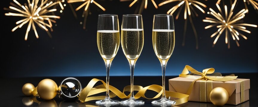 Celebrating the New Year in Style - Champagne Glasses, Close-up View of Seasonal Decoration and Bubbly Drinks in 2026-themed Greeting Card on Black Background