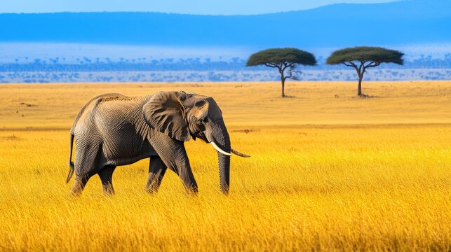 A majestic African elephant stands in grasslands of the African savannah with trees in background. African wildlife concepts.