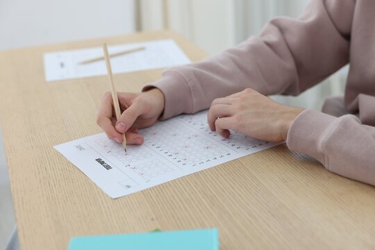 Student filling out answer sheet at wooden table indoors, closeup. Taking exam