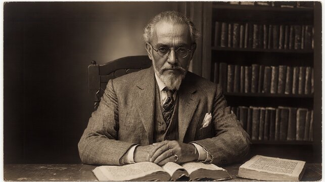 Generative AI, A dignified and contemplative portrait of an elderly scholar, immersed in his studies within a sepia-toned library setting, capturing the essence of intellectual dedication and wisdom