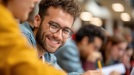 A young man wearing glasses and a denim jacket studying and smiling in a well-lit library, surrounded by fellow students, moments of focus and academic enthusiasm.