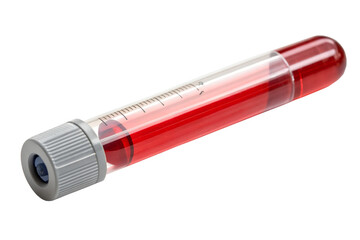 Laboratory blood sample in a clear glass tube with a red cap on a white background, symbolizing medical testing and analysis for health diagnostics