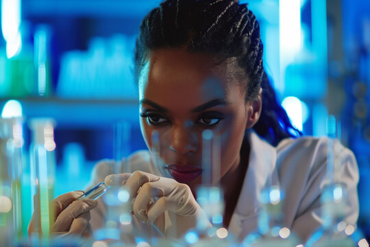 African-American Female Scientist in Laboratory – Conducting Research and Experiments. a laboratory setting, focused on conducting research, analyzing samples, or performing experiments