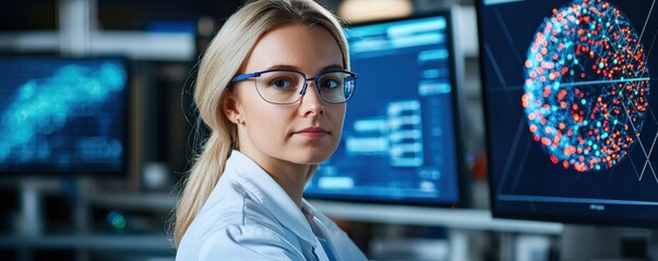 Science performance analysis assessment concept. Professional woman analyzing data on multiple screens in a lab setting.