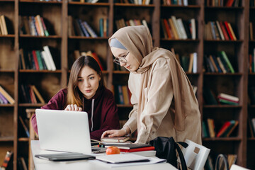 People, students and laptop in library for discussion, planning and working on research assignment. Study group, exam preparation or tech at university for education, collaboration or course feedback