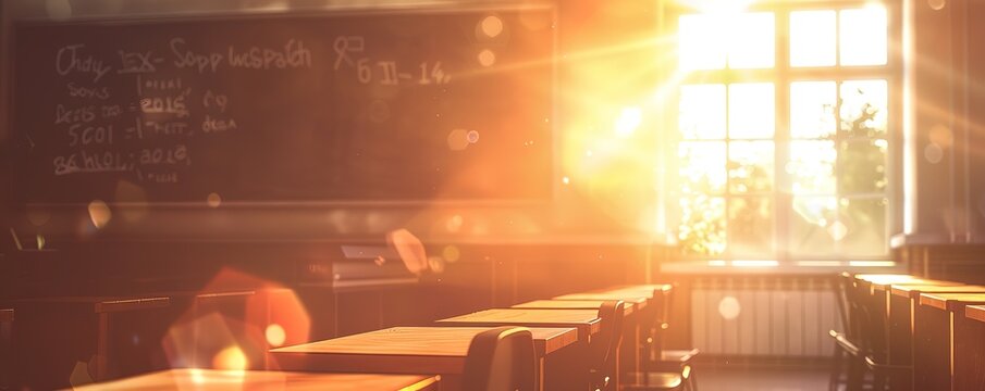 A neatly arranged classroom with glass walls and light beams from the glass windows