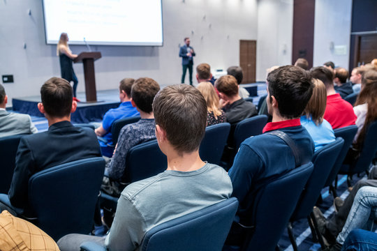Image of a conference that takes place in a large conference room, workshop for young professionals, training in a large conference room, adult training