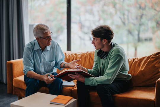 Father assisting young son with homework in cozy home setting