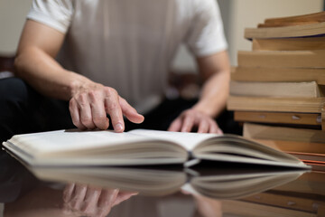 person studying and pointing at an open book, surrounded by stacked books, symbolizing education, research, focus knowledge acquisition in a quiet study environment.