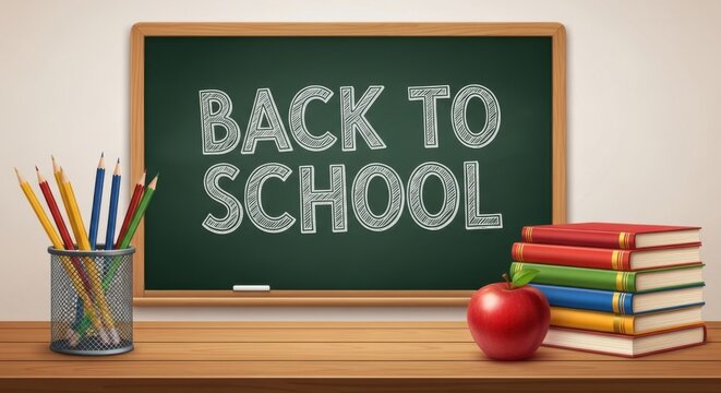 Back to School chalkboard sign with apples books pencils and wooden background for education theme