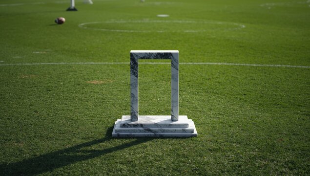 Marble monument placed on a lush green football pitch, highlighting sports environment, World Sports Day