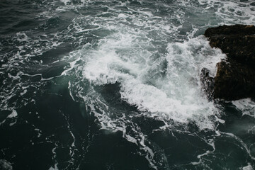 Clear blue ocean waves crashing against rocky cliffs on sunny day