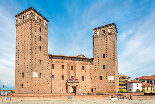 Fossano, Cuneo, Italy - The castle of the Princes of Acaja (XIV century) in piazza Castello, seat of the civic library