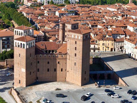 Aerial view of the imposing Castello degli Acaja, a medieval fortress with its robust brick towers, stands proudly against the backdrop of Fossano's terracotta rooftops, Fossano, Piemonte, Italy.