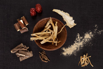 Acanthopanax Senticosus, also called Siberian Ginseng, Eleutherococcus senticosus berries are a widely used herb in traditional Chinese medicine. Close up image with blurred background. Space for text