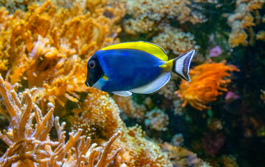 One of the most interesting fish underwater. Powder Blue Tang. Acanthurus leucosternon. Nature background.