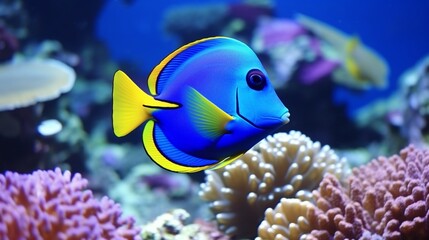 A majestic Powder Blue Tang (Acanthurus leucosternon) swimming gracefully in a coral reef, its vibrant colors shimmering in the crystal-clear water.